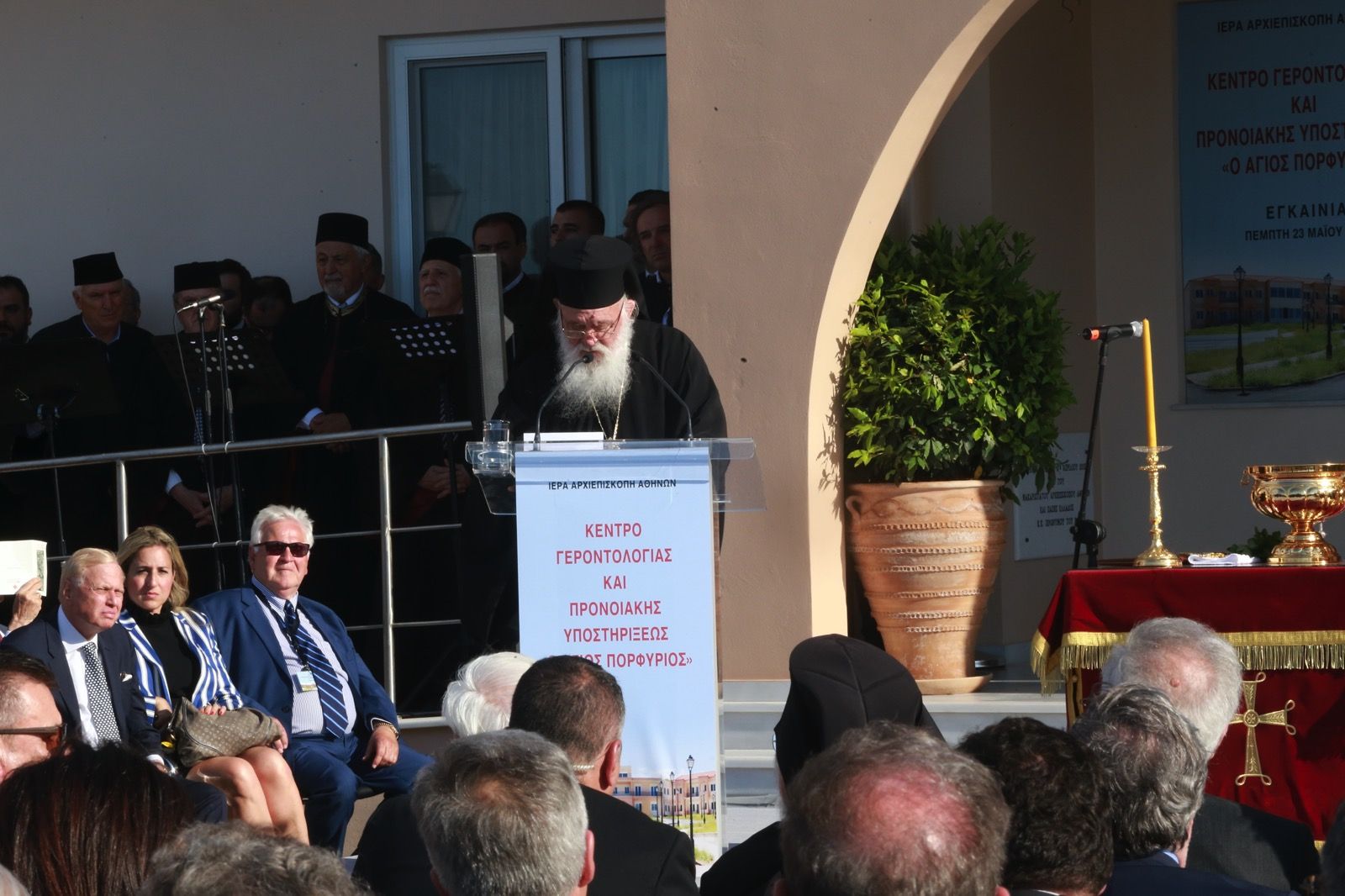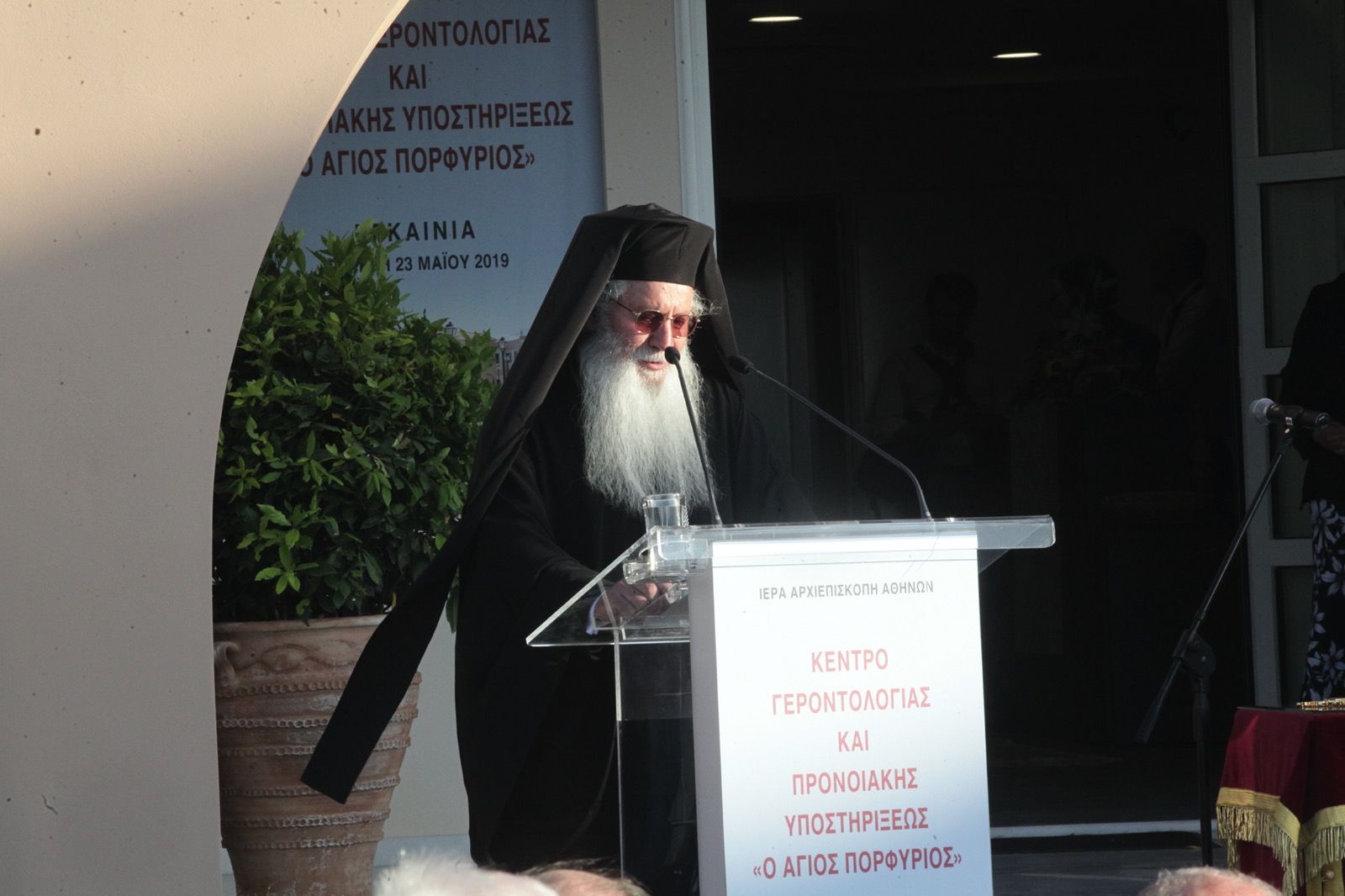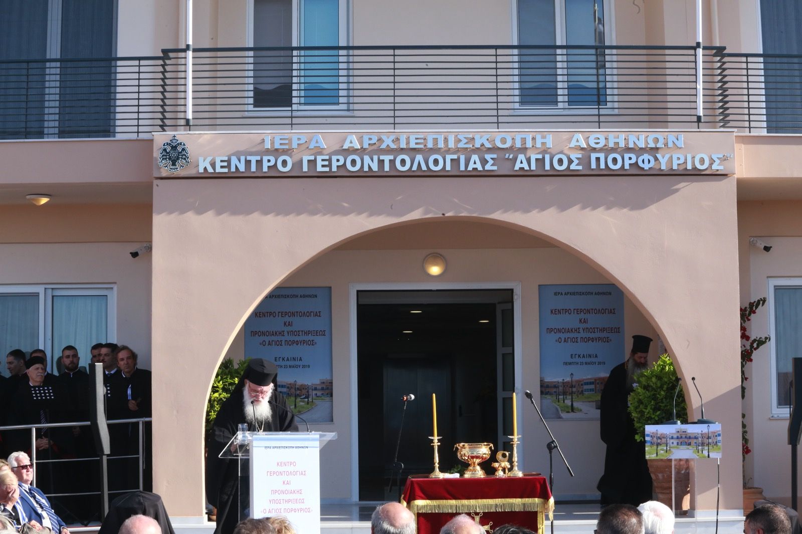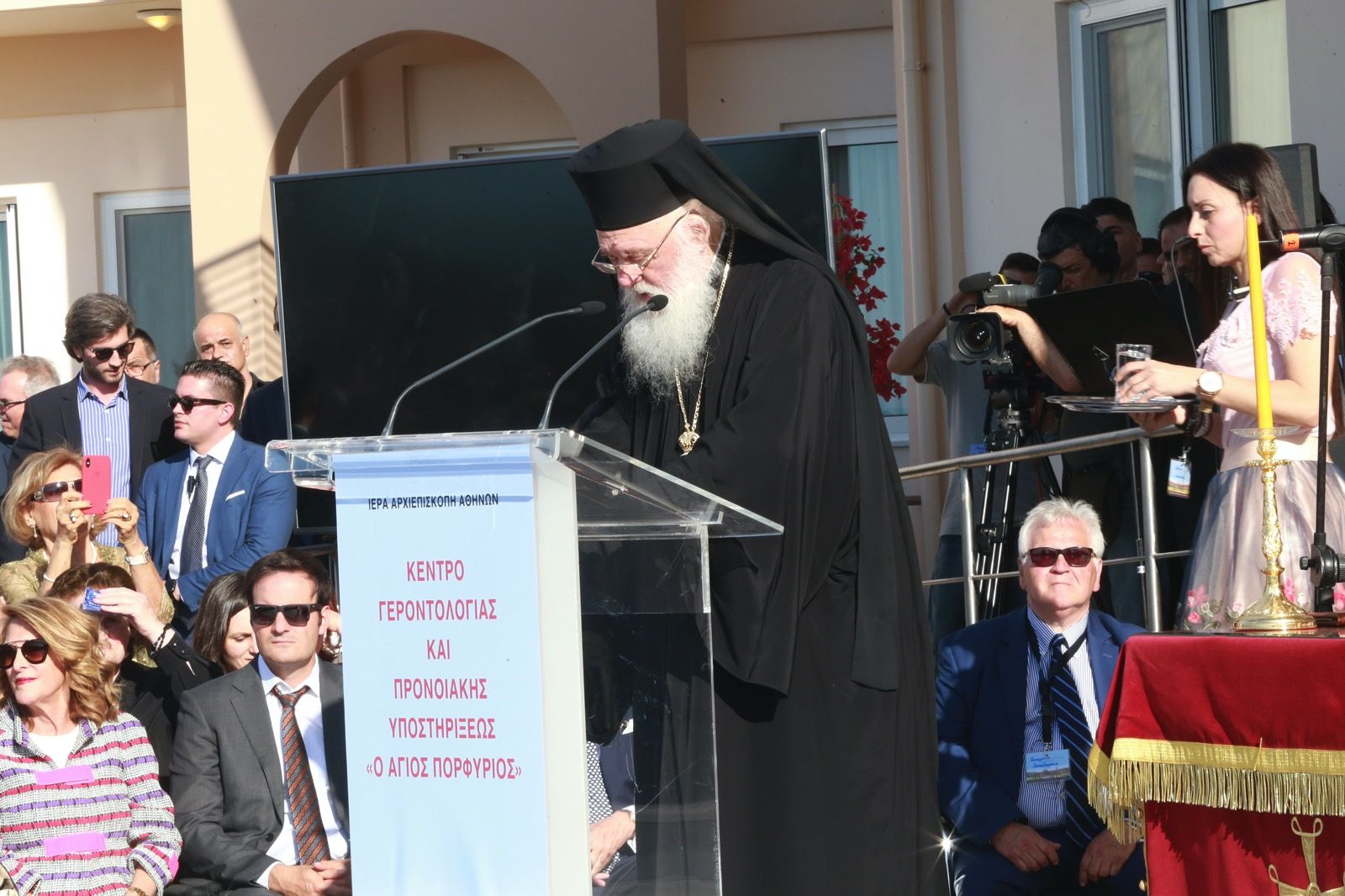 Με ιδιαίτερη συγκίνηση σας καλωσορίζω σήμερα όλους εδώ, στο Κέντρο Γεροντολογίας και Προνοιακής Υποστηρίξεως «Ο ΑΓΙΟΣ ΠΟΡΦΥΡΙΟΣ», της Ιεράς Αρχιεπισκοπής Αθηνών, για τα εγκαίνια μίας νέας εστίας αγάπης, θαλπωρής, στοργής και προσφοράς. Ενός πρότυπου και υπερσύγχρονου Κέντρου φροντίδας για την τρίτη ηλικία, αλλά και συστηματικής εκπαίδευσης και επιστημονικής έρευνας στον τομέα της προνοιακής υποστηρίξεως, φροντίδας υγείας, αντιμετώπισης νόσου Alzheimer και συναφών παθήσεων για ηλικιωμένους, αλλά και για ευπαθείς ομάδες πληθυσμού.